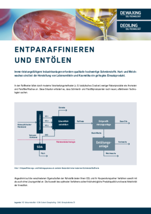 Das Deoiling von Wachsen ist ein Prozess, bei dem aus Paraffingatsch (Slack Wax) Restöle entfernt werden, um ein reines, festes Wachs mit gewünschten Eigenschaften zu erhalten. Dies ist besonders relevant für die Petrochemie, bei der Herstellung von Kosmetika, Pharmazeutika, Lebensmittelverpackungen u.s.w.