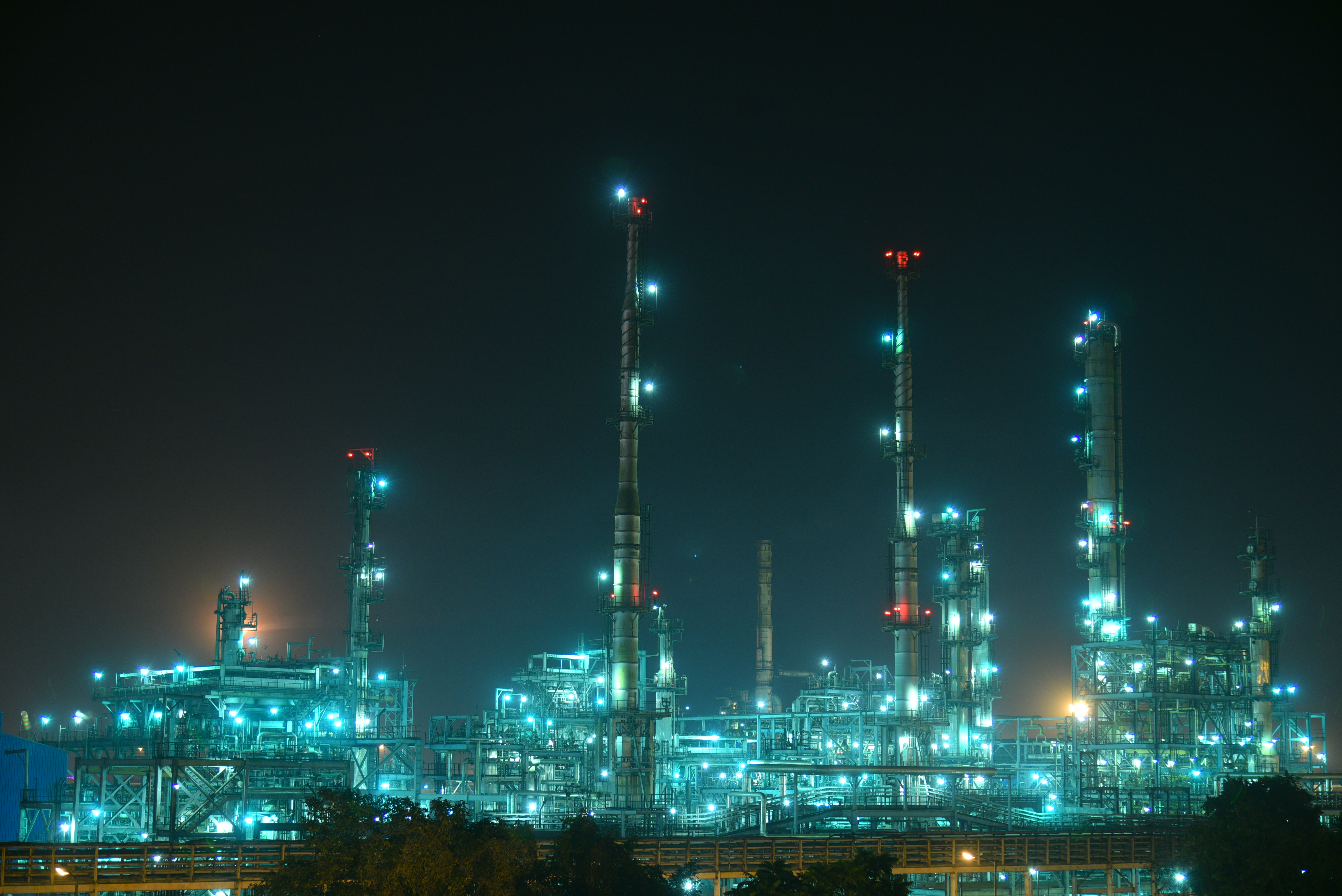 Zwei Ingenieure blicken auf eine Rohöl-Anlage