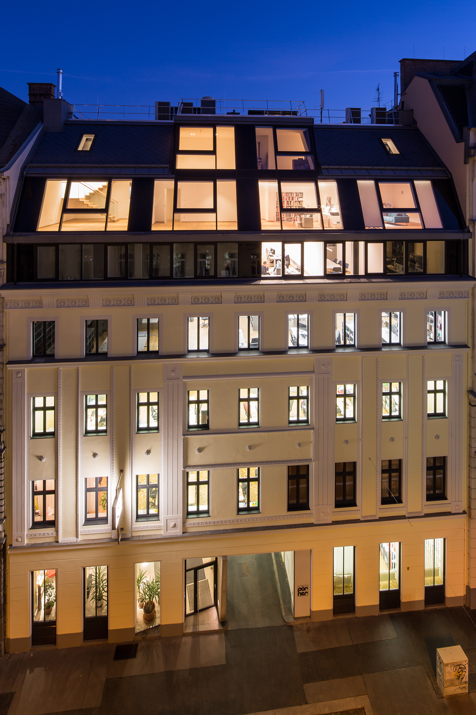 Generalplanung für einen 3-geschossigen Dachausbau bei der Unternehmenszentrale der Pörner Gruppe - eine statische Herausforderung für das aus dem 19. Jh stammende Gebäude. Die drei zusätzlichen Stockwerke (ca. 750 m³) wurden als Stahlkonstruktion auf neue Lastenverteilerbalken aus Stahlbeton aufgesetzt und der Wandaufbau in Glas-, Holz- und Trockenbauweise errichtet. Im Innenhof wurde ein Lift installiert und in dessen Schächten die gesamte Haustechnik neu verlegt. Der Ausbau erfolgte bei laufendem Bürobetrieb.