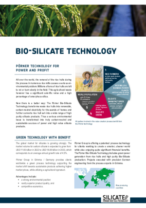Mit der Pörner Bio-Silikat-Technologie können Sie hochreine Bio-Silikate effizient und umweltschonend für vielfältige Anwendungsmöglichkeiten herstellen. Die ausgereifte und patentrechtlich-geschützte Technologie gewinnt aus der Asche von Reishülsen hochwertige Siliziumverbindungen für den Weltmarkt.