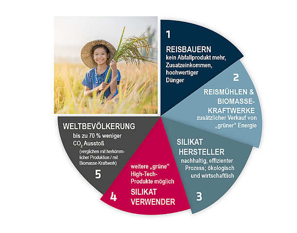 - Die Verwertung von Reishülsen bzw. deren Asche schafft Mehrwert statt Entsorgungskosten und Klimabelastung durch natürliche Verrottung.