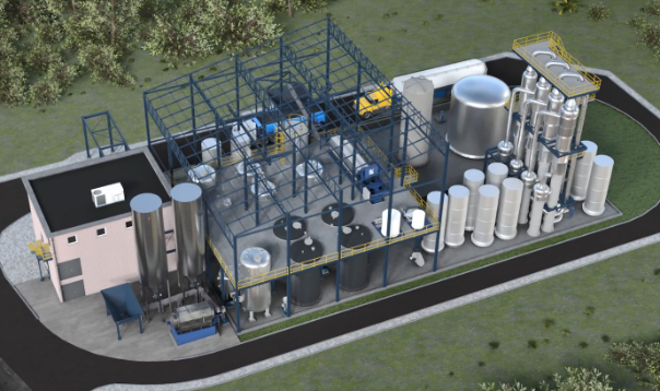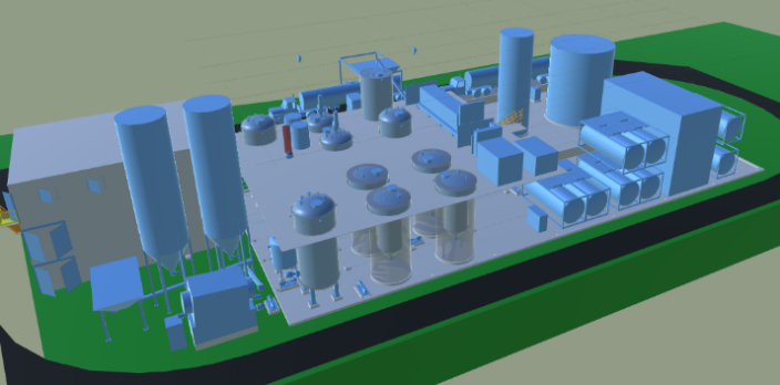 3D Modell einer typischen Pörner Bio-Silikat-Anlage visualisiert das Gesamtkonzept der Anlage und der aufeinanderfolgenden Produktionsschritte von der Verarbeitung der Reishülsenasche (RHA) bis zum Endprodukt Bio-Silikate.