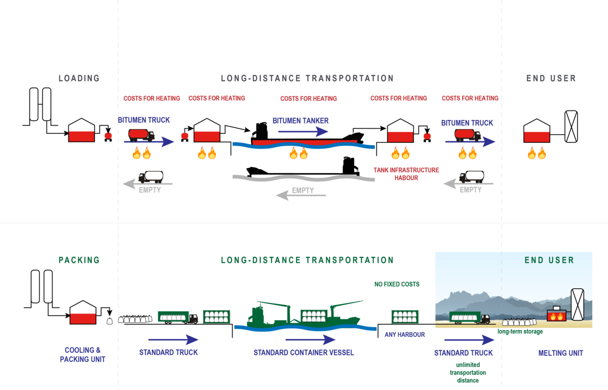The Pörner Bitumen Packing System (PBPS) is a comprehensive cold bitumen logistics/supply chain solution for the bitumen industry. It addresses all aspects of the bitumen producer, logistics, distributor and end-user.